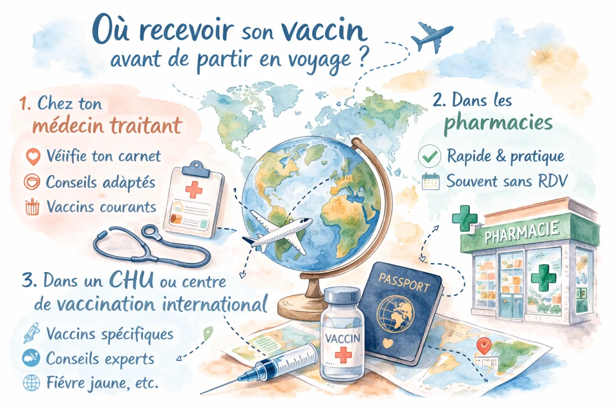 Il existe plusieurs options pour recevoir tes vaccins avant de partir en voyage, et le choix du lieu dépendra principalement du type de vaccin dont tu as besoin.